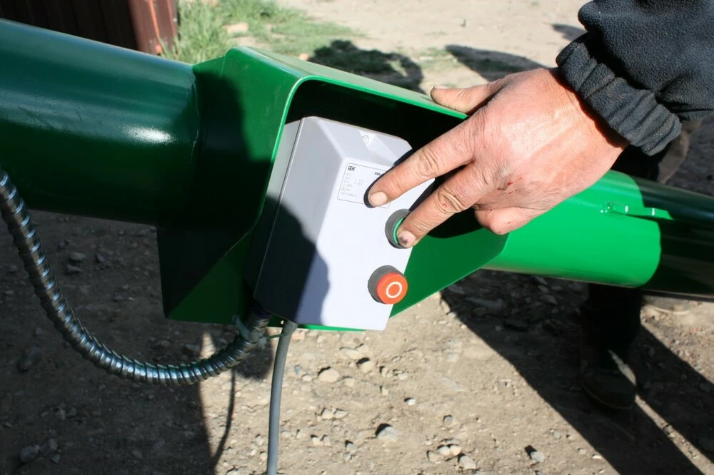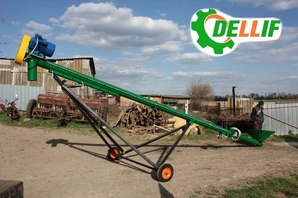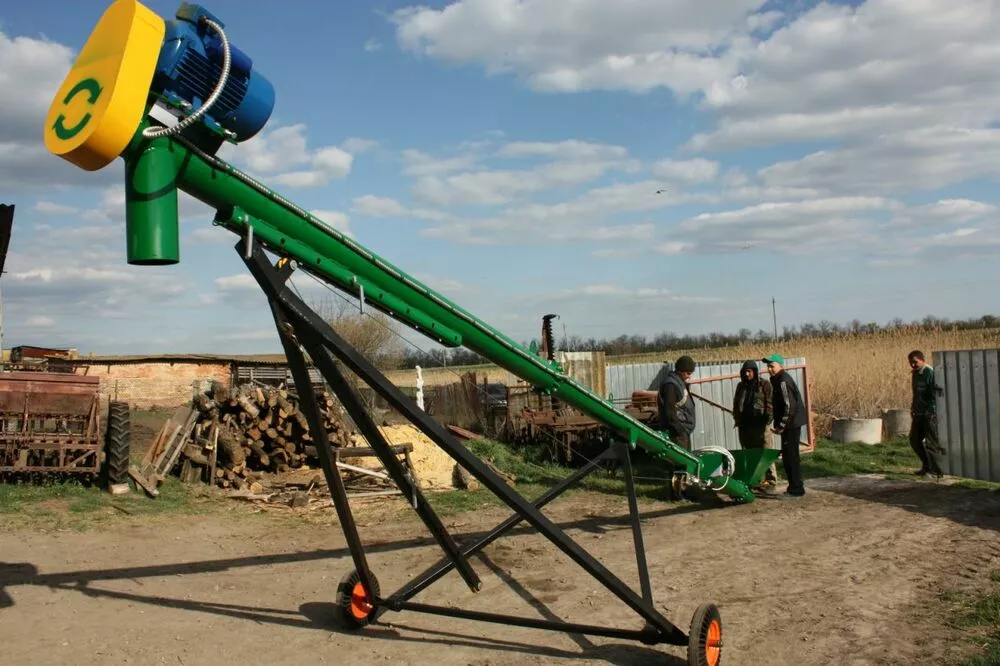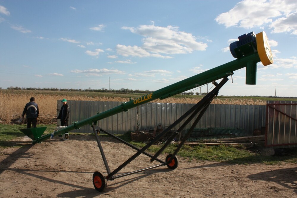 Зернопогрузчик шнековый передвижной, который предназначен для подъема и транспортировки зерна и других сыпучих материалов на необходимую высоту, погрузочно-разгрузочных работ на открытых токах и в зерноскладах и в автотранспортные средства с высокими бортами.