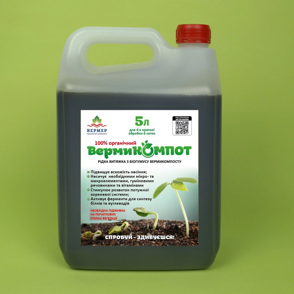 Вермикомпот - это удачное сочетание микро и макроэлементов, в доступной для растений форме, гуминовых веществ и живой полезной микрофлоры. Изготовлен на основе вермикомпоста - продукта переработки червями (Еisеnia fetida) растительной биомассы, для которой мы тщательно подобрали травы и фазу их сбора. Разнообразие трав с их уникальным составом микро и макроэлементов, аминокислот, витаминов и ферментов, полезной микрофлоры вдохновило нас на это название – ВермиКОМПОТ.
