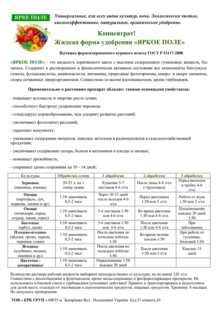 «ЯРКОЕ ПОЛЕ» - это жидкость коричневого цвета с высоким содержанием гуминовых веществ, без запаха. Содержит в растворенном и физиологически активном состоянии все компоненты биогумуса: гуматы, фульвокислоты, аминокислоты, витамины, природные фитогармоны, микро- и макро элементы, споры почвенных микроорганизмов. Совместимо со всеми ядохимикатами, кроме гербицидов.