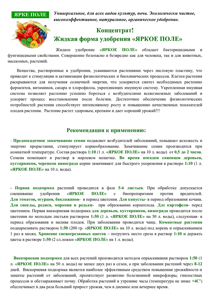 Концентрат!                                                                                                Жидкая форма удобрения «ЯРКОЕ ПОЛЕ»