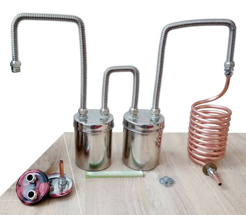 На фото представлены, лишь несколько вариантов комплектации дистилляторов. Благодаря единому стандарту 1/2 дюйма Вы можете подобрать свой индивидуальный комплект.