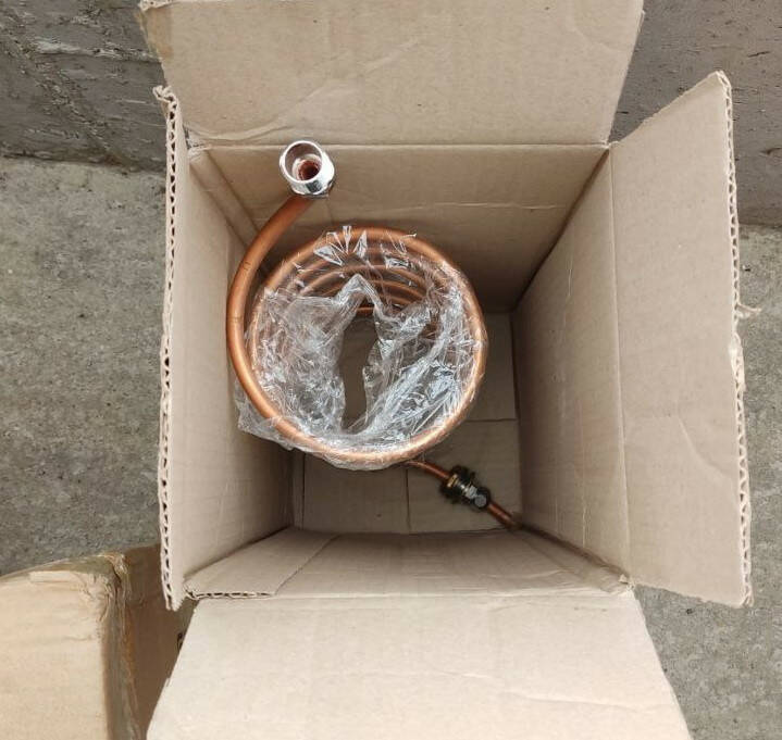 - медный змеевик непроточный 3метра диаметр колец 14см диаметр трубки внешний 10мм внутрений 8мм с переходом 1/2 дюйма