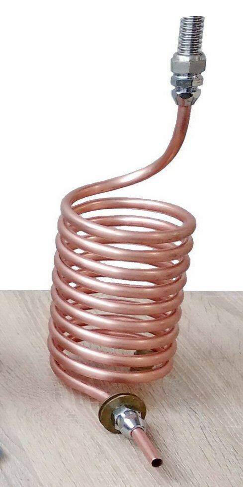 15. Стандартные змеевики имеют специально зауженный диаметр витков 14 сантиметров для того что бы их можно было монтировать в емкости с узкой горловиной (алюминиевые бидоны, пластиковые бочонки и т.д. Мы так же предлагаем более мощьные и широкие змеевики 4-5 метров с диаметром колец 18 сантиметров.