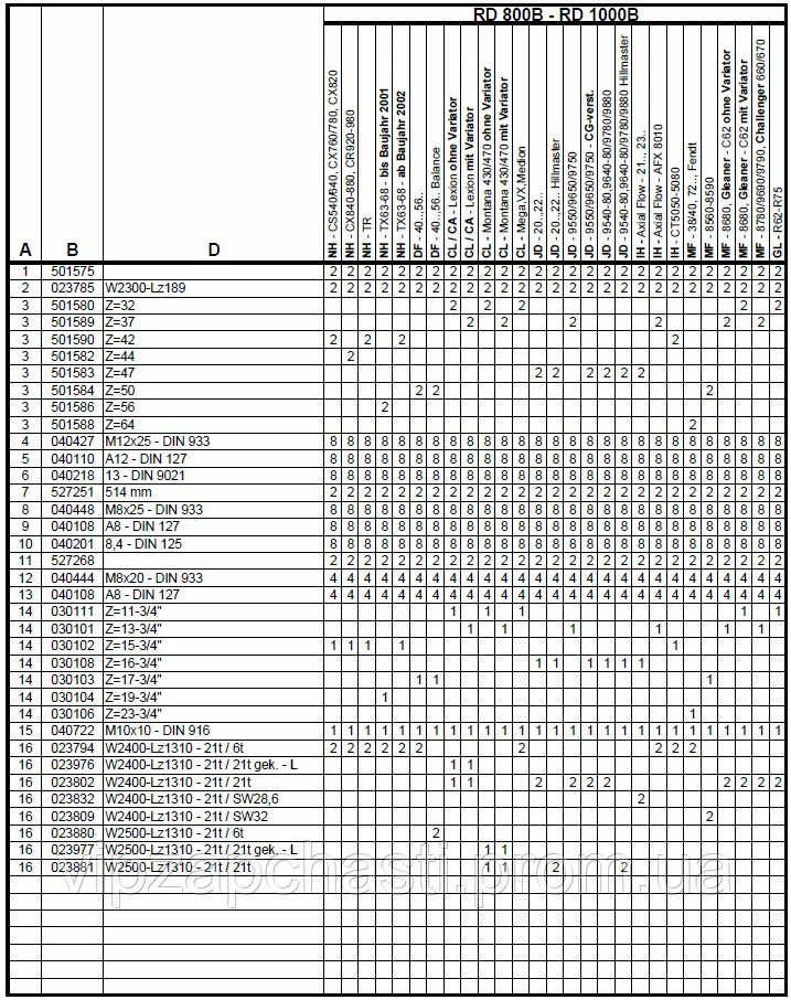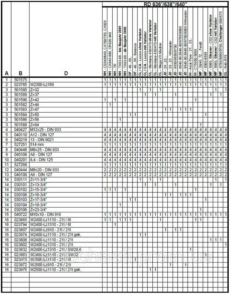 на CL / CA - Lexion (ohne Variator), CL - Montana 430/470 (ohne Variator), CL - Mega,VX,Medion, MF - 8680, Gleaner - C62 mit Variator, GL - R40-R75