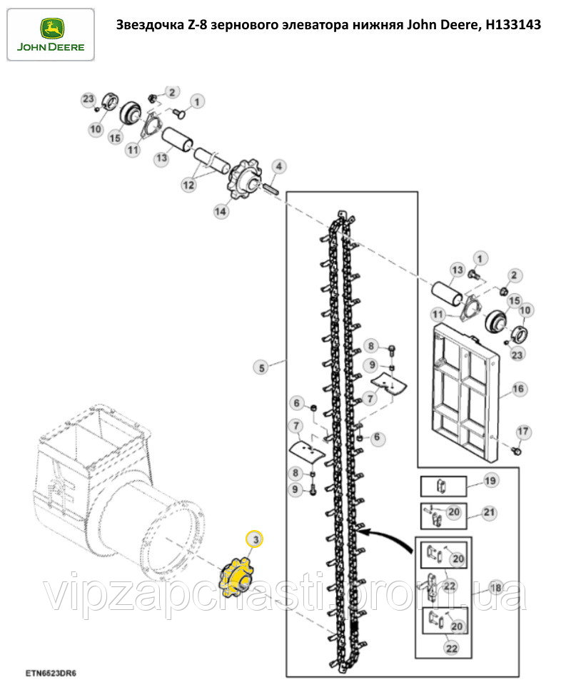 на комбайн John Deere CTS, CTS II, 9400, 9410, 9450, 9500, 9510, 9510SH, 9550SH, 9560, 9560SH, 9600, 9610, 9650, 9650CTS, 9660, S670, All Lower Clean Grain Elevator